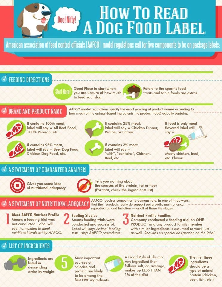 How to Read Dog Food Nutrition Labels [Decoding Pet Foods] How do you read a dog food chart? The simplest way is to look at the order of the ingredients on the label. Protein should always take the top spot and for dogs with allergies, there should be none of the allergy triggers on the list. Pet owners should also look at the percentage of each ingredient.